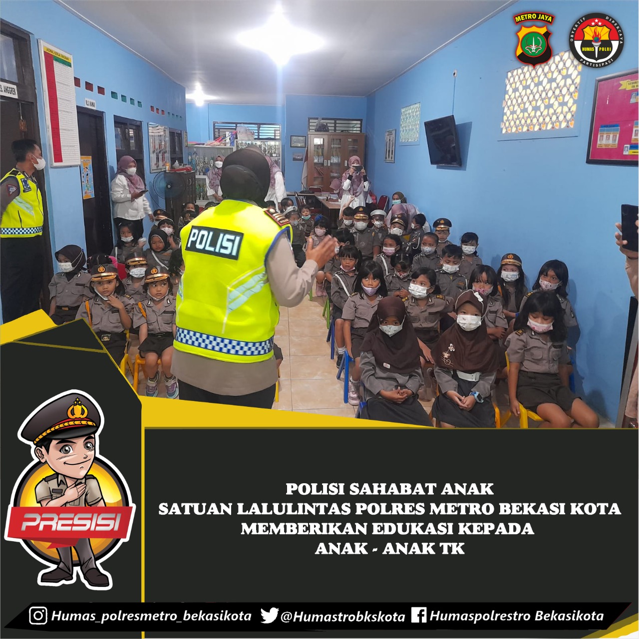 REPORTASEJAKARTA.COM KOTA BEKASI, – Sambut hari Bhayangkara ke-76, Satlantas Polres Metro Bekasi Kota melaksanakan kegiatan Polisi Sahabat Anak (Polsanak) dengan mengunjungi TK Bhayangkari 56 di jalan Pramuka, Bekasi Selatan, Selasa (7/6/2022).