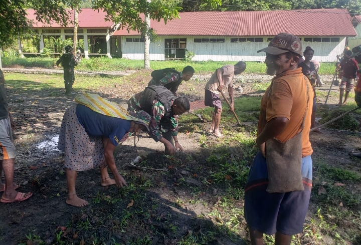 REPORTASEJAKARTA.COMKEEROM. Bersama warga kampung perbatasan RI-PNG, personel Pos Batom Satgas Pamtas RI-PNG Yonif 126/KC melaksanakan karya bakti di Kampung Batom, Distrik Batom, Kabupaten Pegunungan Bintang.