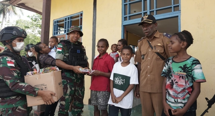KEEROM, Pos Kout Satgas Pamtas Yonif 126/KC dipimpin Wadan Satgas Mayor Inf Wahidin Sobar, Sos. berbagi keceriaan dan kebahagiaan bagikan 100 bingkisan serta sembako kepada masyarakat dan anak-anak di Kampung Pund Distrik Waris, Kabupaten Keerom, Papua. Hal tersebut disampaikan Dansatgas Pamtas Yonif 126/Kala Cakti, Letkol Inf Dwi Widodo, S.H., M.Han. dalam rilis tertulisnya di Kabupaten Keerom, Papua, Senin (27/06/2022). Pembagian bingkisan makanan berupa mie instan, buku tulis, beras, naraga dan susu bubuk tersebut, dalam rangka berbagi kasih dan rezeki terhadap masyarakat sebagai wujud kepedulian terhadap sesama, khususnya dalam memberikan kebahagiaan kepada anak-anak di perbatasan Papua. “Kita ingin memberikan kebahagiaan kepada anak-anak Papua, karena senyum dan tawa anak-anak Papua adalah senyum kami juga selaku personel Satgas,” ujarnya. Selaku Wadan Satgas, dirinya pun berharap melalui kegiatan seperti ini keberadaan dan kehadiran TNI di tengah-tangah masyarakat semakin lebih berarti dan bermanfaat. Selama kegiatan tampak terlihat masyarakat dan anak-anak tersenyum bahagia ketika mendapatkan sembako dan bingkisan pemberian dari Satgas Yonif 126/KC.