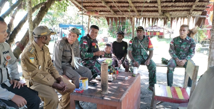 KEEROM, Satgas Pamtas Yonif 126/KC Pos Batom bersama Apkam TNI-Polri setempat dan Aparat Pemerintah Kab. Pegunungan Bintang mengggelar pertemuan dengan masyarakat setempat untuk memulihkan kembali stabilitas keamanan di Distrik Batom, Kabupaten Pegunungan Bintang, Papua.