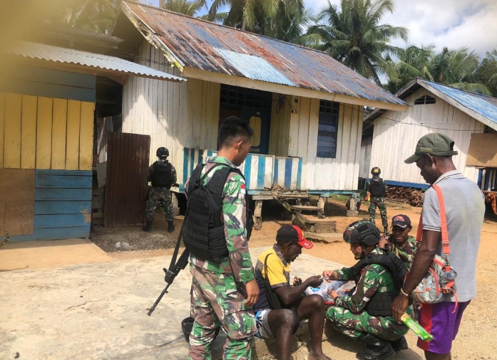 KEEROM,  Tim Kesehatan Satgas Pamtas Yonif 126/KC Pos Yabanda memberikan pelayanan kesehatan berupa pengobatan gratis secara keliling kampung binaan Yabanda Distrik Waris, Kabupaten Pegunungan Keerom, Papua.