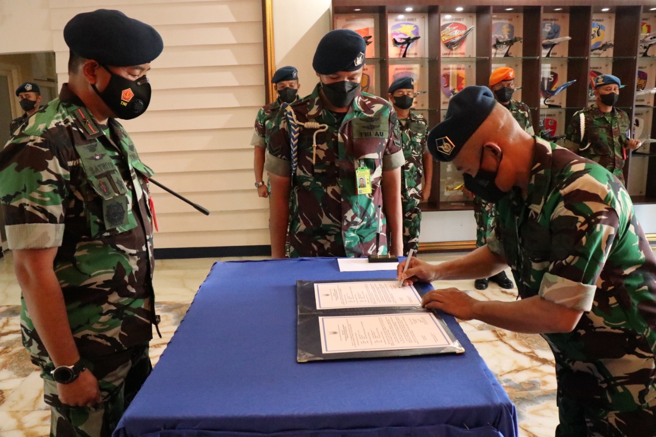 Komandan Lanud Sam Ratulangi Marsma TNI M. Satriyo Utomo, S.H., menerima laporan penyerahan jabatan Kepala Dinas Personel (Kadispers) Lanud Sam Ratulangi