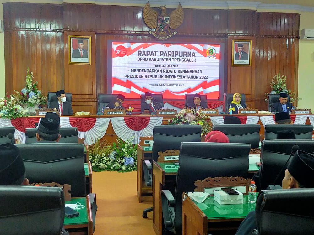 Peringati Hari kemerdekaan indonesia yang ke-77 DPRD Trenggalek adakan rapat paripurna dengan mengundang beberapa OPD dalam rangka mendengarkan pidato kenegaraan presiden republik indonesia tahun 2022 Di ruang graha paripurna DPRD Kabupaten Trenggalek. Selasa (16/08/2022)