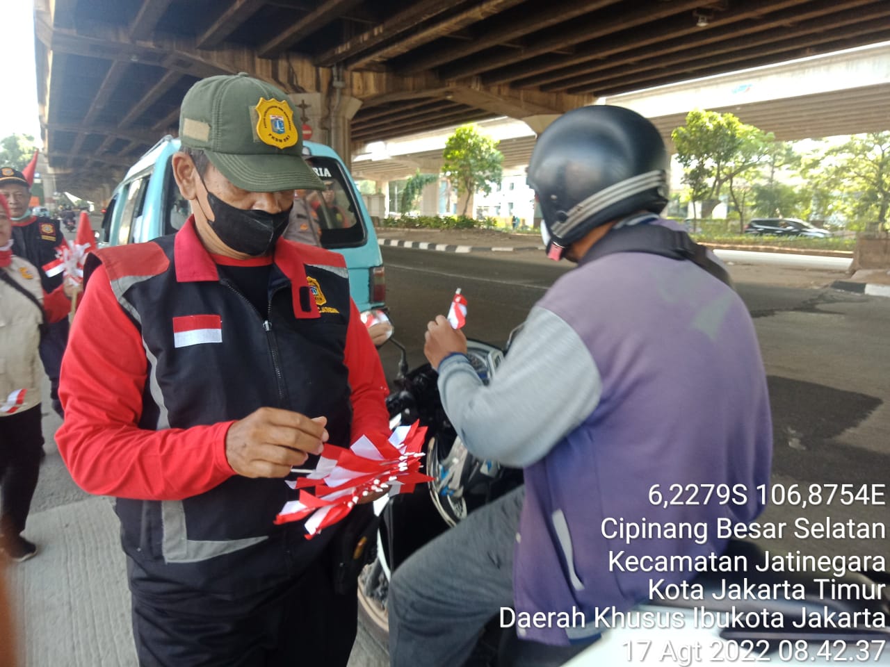 Kemerdekaan Republik Indonesia yang dipimpin Camat Jatinegara Bapak H. Muchtar, S.E., M.Si. Pembagian bendera gratis tersebut untuk menumbuhkan kembali kesadaran masyarakat memasang bendera menyambut Hari Kemerdekaan. Selain itu juga untuk mengingat kembali jasa para pahlawan serta mengobarkan kembali semangat patriotisme. (Ferry). (Sumber: Dedi Satria, FKDM Jatinegara)