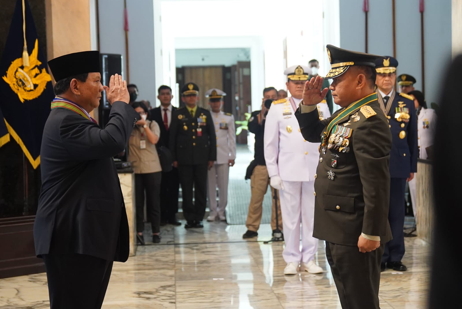 REPORTASE JAKARTAJAKARTA, – Kepala Staf Angkatan Darat (Kasad) Jenderal TNI Dr. Dudung Abdurachman, menyematkan Tanda Kehormatan Bintang Kartika Eka Pakci Utama kepada Menteri Pertahanan RI Letjen TNI (Purn) Prabowo Subianto, bertempat di Ruang Hening Gedung Jenderal Soedirman, Kemhan, Jakarta, Senin (15/8/2022).