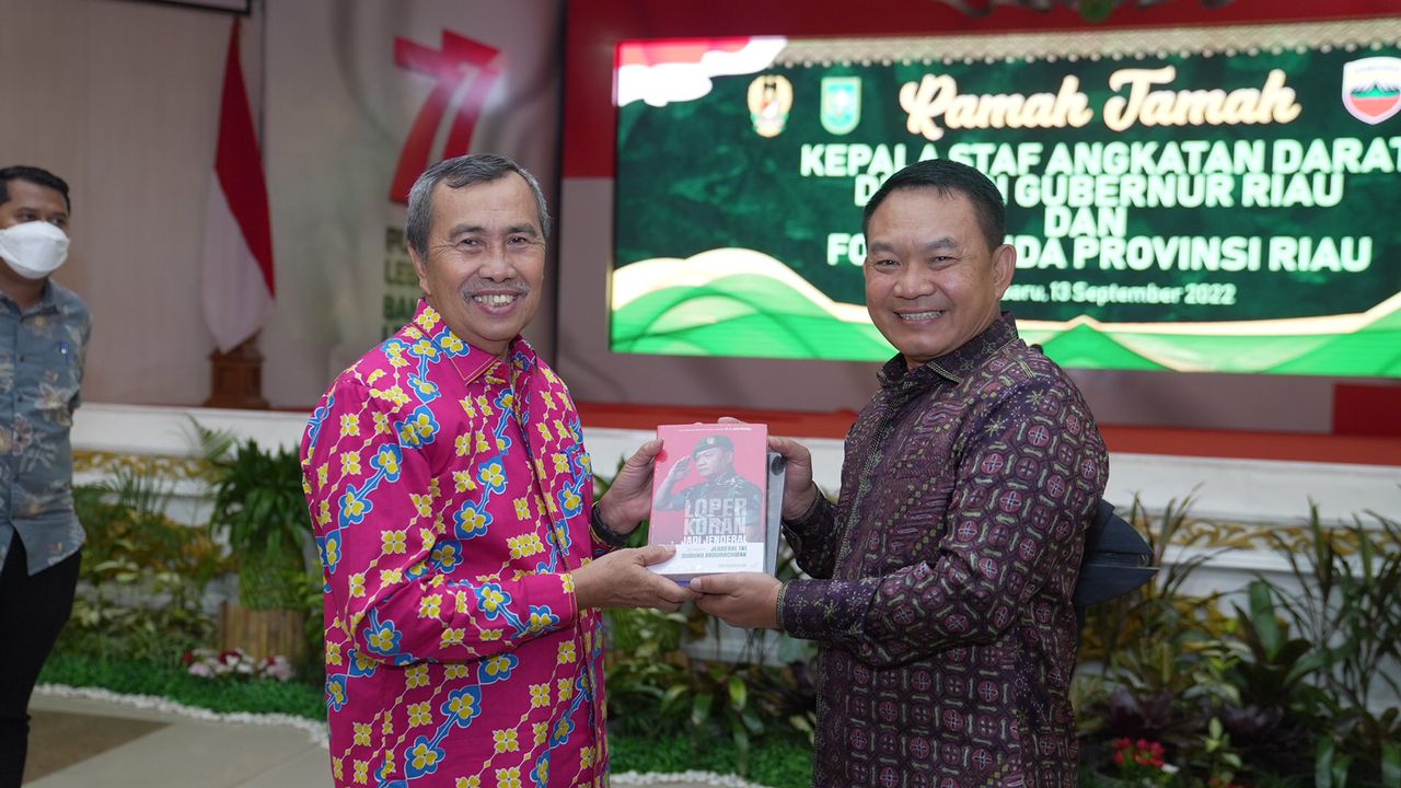 nasyarakatnya santun, rukun dan damai”. Lantunan bait pantun mengawali sambutan Kepala Staf Angkatan Darat (Kasad) Jenderal TNI Dr. Dudung Abdurachman saat menghadiri acara ramah tamah dengan Gubernur Riau serta Forkopimda Provinsi Riau yang digelar di Kantor Gubernur Riau, Pekanbaru, Selasa (13/9/2022). Dalam sambutannya, Kasad menyampaikan terima kasih kepada seluruh komponen masyarakat Riau yang telah menjaga keharmonisan dan kedamaian dalam kehidupan bermasyarakat. “Saya merasa senang dan bangga, kehidupan bermasyarakat di Provinsi Riau yang saling menghormati dan menghargai hingga terbangun kehidupan masyarakat yang harmonis dan damai. Kondisi ini yang harus selalu kita jaga, agar pembangunan di negara yang kita cintai ini dapat berjalan dengan baik, ” ungkap Kasad. Pada kesempatan yang sama, Gubernur Riau Drs. H. Syamsuar, M.Si, menyampaikan ungkapan terima kasih serta kebanggaannya atas kunjungan Kasad di daerahnya. Gubernur menyampaikan, stabilitas keamanan di wilayah Provinsi Riau tidak lepas dari sinergitas hubungan antara pemerintah daerah dengan seluruh aparat TNI dan Polri dalam menjaga kebersamaan dan kerukunan masyarakat. “Membuat anyaman dari jerami, Indah tersusun di tepi perigi, Malam ini kita bersilaturahmi, Membangun sinergi majukan negeri,” Sebait pantun menjadi penutup sambutan Kasad. (Red).