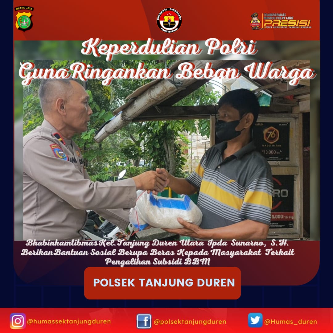 REPORTASE JAKARTAJAKARTA – Polsek Tanjung Duren Polres Metro jakarta barat membagikan bantuan berupa beras kepada warga yang terdampak akibat pengalihan subsidi bbm, lokasi berlangsung di Jln Taman Daan Mogot Rw 01 Kelurahan Tanjung Duren Utara Kec.Grogol Petamburan Jakarta Barat, Rabu (21/09/22)