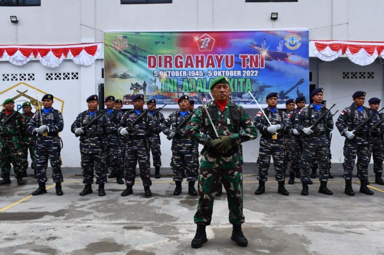 KEPULAUAN ANAMBAS-5 Oktober 2022,– Dengan tema “TNI Adalah Kita”, Komandan Lanal Tarempa Letkol Laut (P) Yovan Ardhianto Yusuf, S.E., M.Tr.Opsla sebagai Inspektur Upacara pimpin langsung pelaksanaan Upacara Peringatan Hari Ulang Tahun Tentara Nasional Indonesia ke-77 tanggal 05 Oktober 2022, di wilayah Kabupaten Kepulauan Anambas dengan Komandan Upacara Danramil 02 Tarempa.