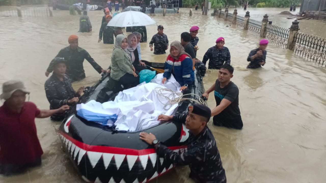 ACEH UTARA– Pangkalan TNI Angkatan Laut (Lanal) Lhokseumawe bersama Kipan B Yonko 469 Kopasgat melaksanakan penanggulangan banjir yang merendam Kabupaten Aceh Utara meluas ke 12 kecamatan. Banjir menyebabkan Ibukota Aceh Utara terendam serta 18.160 warga mengungsi ke sejumlah titik lebih tinggi.
