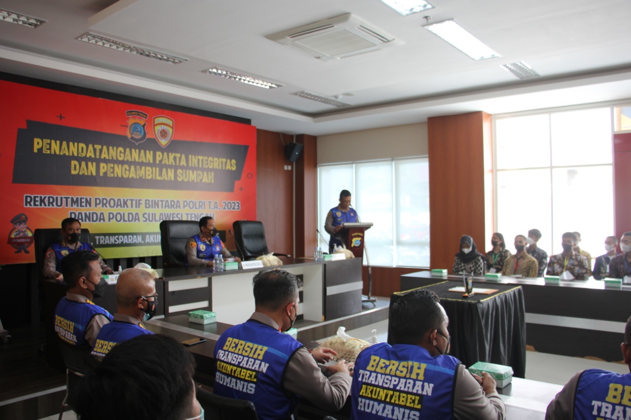 Sebanyak 65 pemuda-pemudi Sulteng hari ini mengikuti penanda tanganan pakta integritas dan pengambilan sumpah panitia, peserta dan orang tua yang dipimpin oleh Wakapolda Sulteng Brigjen Polisi Hery Santoso, SIK, MH di Aula lantai I Polda Sulteng, Senin (17/10/2022) sore