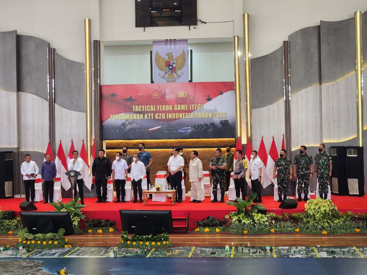 DENPASAR –– Kepala Staf Angkatan Darat (Kasad) Jenderal TNI Dr. Dudung Abdurachman mendampingi Presiden RI dalam pelaksanaan Tactical Floor Game (TFG) Pengamanan Presidensi G20 yang dipimpin Panglima TNI di GOR Kepaon Prajaraksaka Denpasar, Bali. Rabu, (9/11/2022).