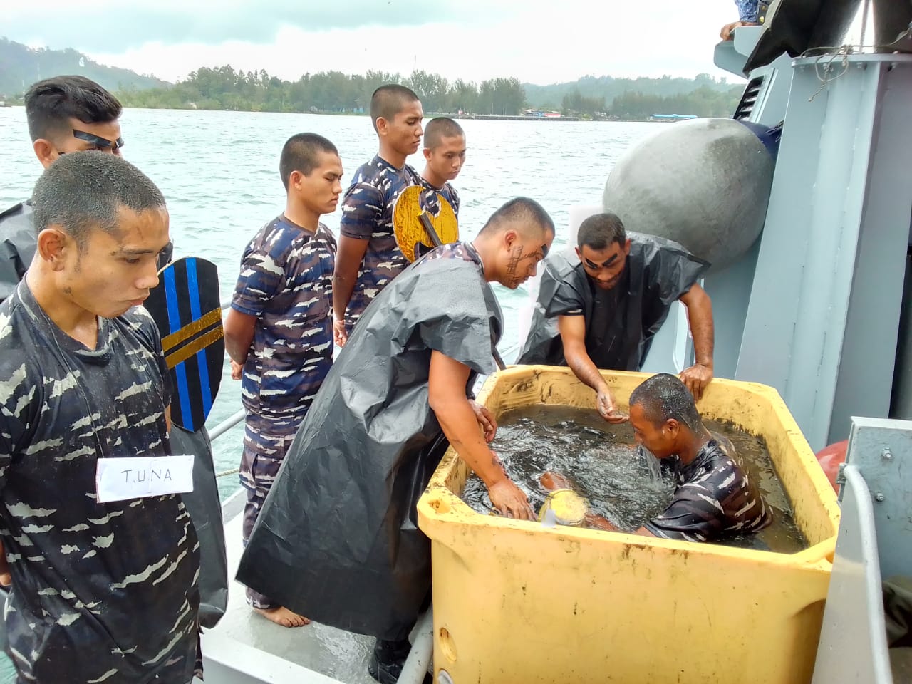 SIMEULUE — 14 November 2022,– Pangkalan TNI AL Simeulue melaksanakan upacara penutupan masa orientasi prajurit Tamtama Remaja dengan tradisi Mandi Samudera diatas geladak KAL Sinabang I-1.69. Masa orientasi resmi ditutup oleh Komandan Lanal Simeulue Letkol Laut (P) Hendra Dwinanto, S.H., M.Tr. Opsla di KAL Sinabang, Sabtu (12/11/2022).