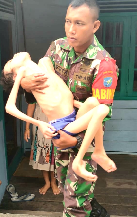 REPORTASE JAKARTABUNTOK — (13/11/2022) – Seorang Babinsa yang terlihat sedang membopong seorang anak dalam keadaan sakit dan selama 8 Tahun berbaring di dalam rumah yang bertempat di Jalan Karau Gang Swarga Kecamatan Dusun Selatan, Jumat 11 November 2022.