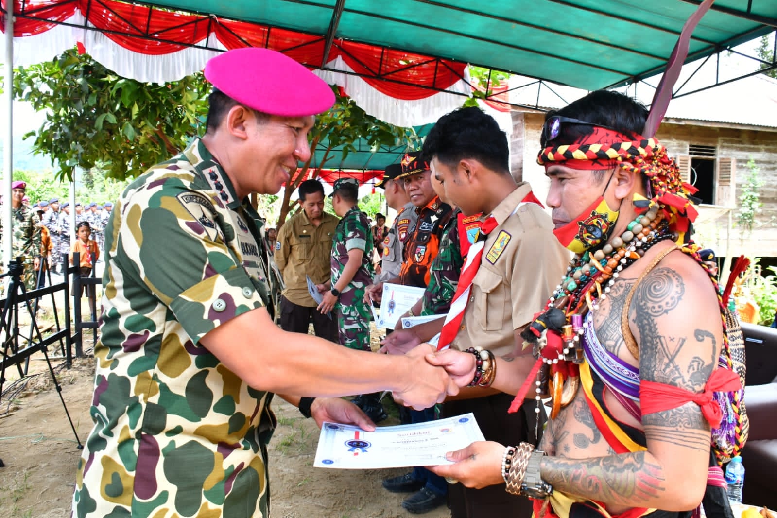 Penyerahan cinderamata kepada Bupati sambas diwakili oleh Drs. Sunaryo, perwakilan pemilik rumah sejarah beserta penyerahan sertifikat kepada Ketua Pemuda Pancasia Sambas, perwakilan SMKN 1 Sambas, Ketua Dewan Adat Dayak Sambas, Komunitas Barongsai Kecamatan Sajingan yang berpartisipasi ikut dalam kegiatan Napak Tilas Aruk 77 KM. Kemudian dilanjutkan penyerahan bantuan sosial kepada perwakilan masyarakat oleh Wadan Lantamal XII.