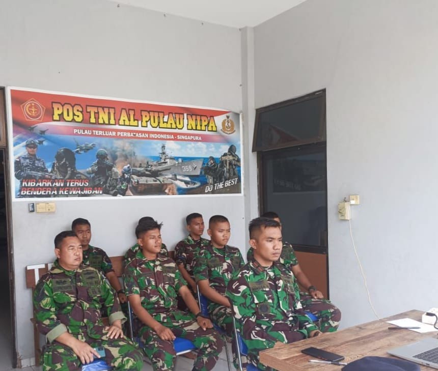 BINTAN –– Dansatgas Pulau Nipa Letda Laut (K) Ringga Aldafio mengikuti video conference (vicon) Danrem 033/WP selaku Dankolakops Satuan Tugas Pengamanan Pulau Terluar (Satgas Pam Puter) yang diwakili Kasiops Korem 033/WP Letkol Inf Febi Triandoko, M.Si., dalam rangka pengarahan dan evaluasi Satuan tugas (Satgas) Pengamanan Pulau Terluar Wilayah Barat TA. 2022 di Posal Pulau Nipa, Selasa (15/11/2022).