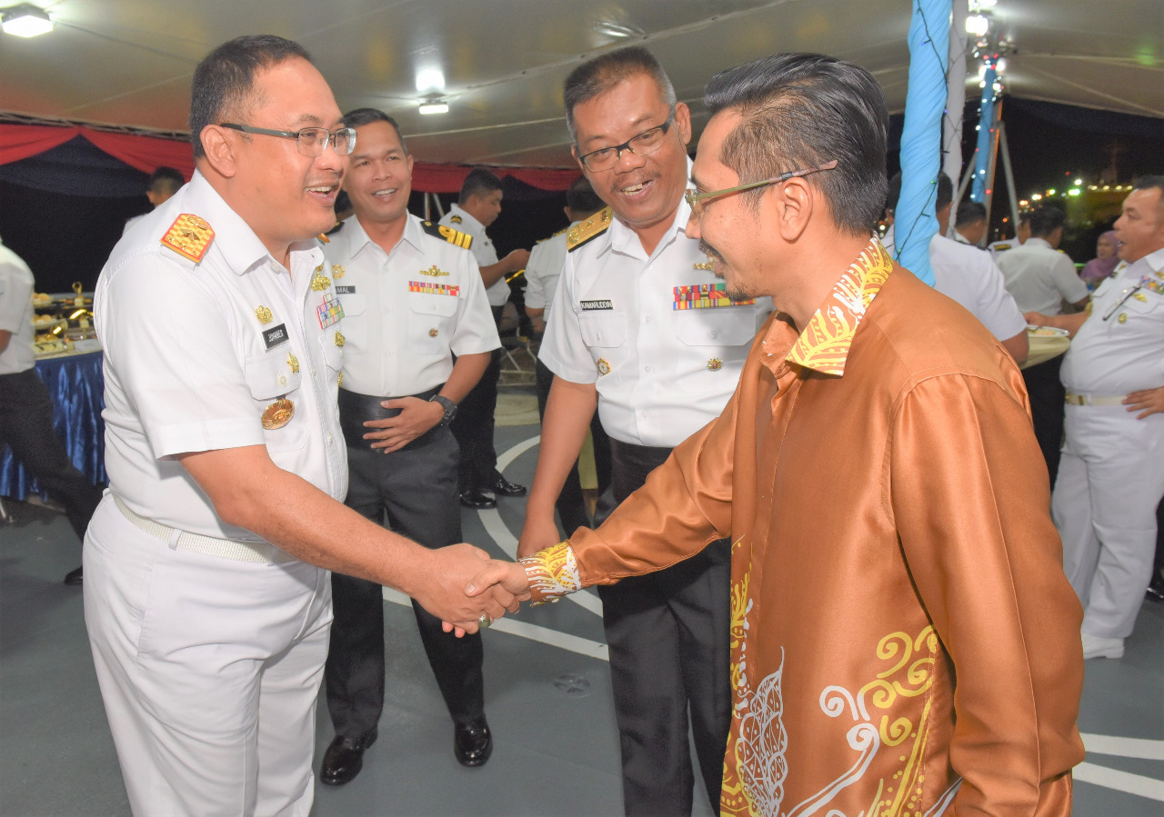 BELAWAN –– Komandan Lantamal (Danlantamal) I Laksamana Pertama TNI Johanes Djanarko Wibowo menghadiri Cocktail Party atau jamuan makan malam yang diselenggarakan oleh Deputi Western Fleet Comander TLDM First ADMR Khomarudin Omar diatas Kapal Perang Malaysia KD Teguh Samudera yang saat ini tengah melaksanakan kunjungan kehormatan di Kotama Angkatan Laut Lantamal I Belawan, yang bersandar di Dermaga Pelindo 103, Jalan Ujung Baru Belawan, Kamis, (17/11/2022).