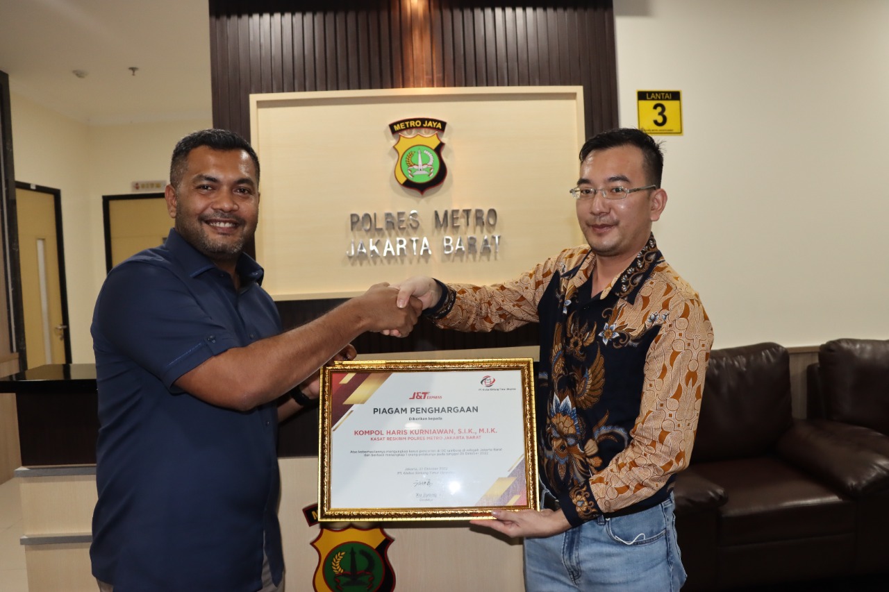 Tampak terlihat pihak J&T ekspres memberikan penghargaan diantaranya kepada kapolres Metro Jakarta Barat Kombes Pol Pasma Royce, Kasat Reskrim Polres Metro Jakarta Barat Kompol Haris Kurniawan, Wakasat reskrim Kompol Niko Purba, Kanit krimum Akp Avrilendy dan Kasubnit Jatanras Iptu M Rizky Ali Akbar