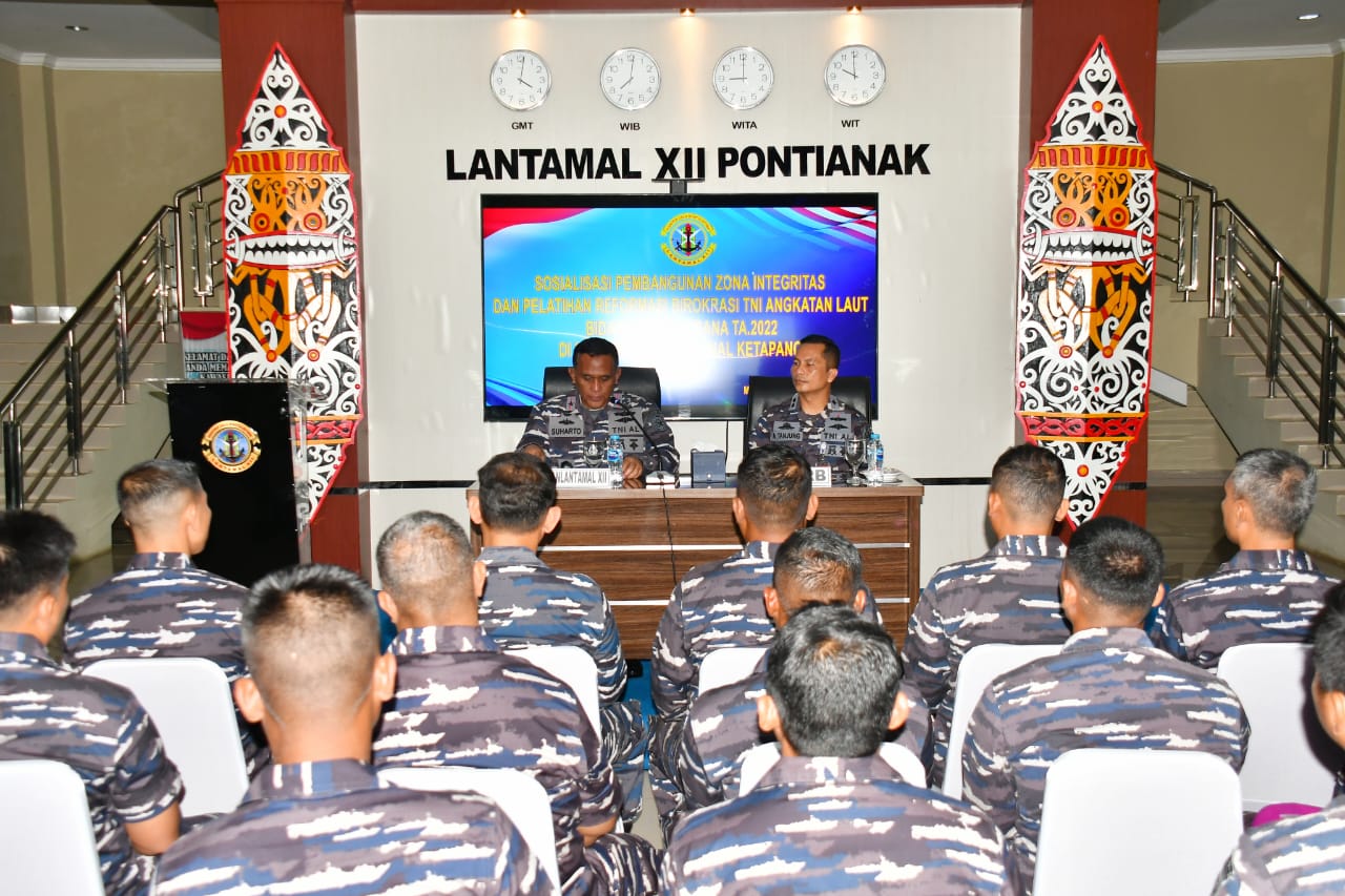 “Kegiatan sosialisasi reformasi birokrasi yang akan dilaksanakan selama dua hari ini bertujuan untuk memberikan pemahaman tentang pembangunan zona integritas, pelaksanaan penataan reformasi birokrasi sekaligus pelatihan pengisian lembar kerja evaluasi penilaian mandiri pelaksanaan zona integritas sesuai bidang masing-masing dan tiap-tiap satuan kerja TNI Angkatan Laut, khususnya di Lantamal XII Pontianak,” ucap Danlantamal XII. “Program reformasi di lingkungan TNI Angkatan Laut berfokus untuk mengoptimalkan peran tugas dan fungsi TNI secara tepat, melaksanakan pembenahan administrasi maupun penataan organisasi secara menyeluruh, konsisten dan berkelanjutan dalam mewujudkan tata kelola pemerintah yang bersih berwibawa serta akuntabel,” jelasnya. “Diharapkan agar seluruh personel Lantamal XII Pontianak bisa memahami dan mengerti sehingga dapat melaksanakan tugas-tugasnya secara optimal serta nantinya mampu meraih predikat WBK (Wilayah Bebas dari Korupsi) secara berkelanjutan dan akhirnya bisa mendapat predikat WBBM (Wilayah Birokrasi Bersih dan Melayani),” harap Laksma TNI Suharto. “Kepada seluruh peserta sosialisasi Reformasi Birokrasi (RB) yang hadir, saya tekankan agar benar-benar mengikuti dengan seksama kegiatan sosialisasi ini dan jangan segan-segan untuk berinteraksi atau bertanya bila ada hal yang perlu diketahui,” pesannya. “Ingatlah bahwa tunkin bukan hak namun merupakan reward atas kinerja yang kita berikan untuk organisasi ini. Mulailah untuk mau tahu bagaimana melaksanakan agenda Reformasi Birokrasi (RB) mulai dari kita sendiri serta menerapkan satuan kerja kita masing-masing. manfaatkan kegiatan ini sebaik-baiknya demi kemajuan organisasi di TNI Angkatan Laut dan Lantamal XIl Pontianak yang kita cintai,” pungkas Danlantamal XII Laksma TNI Suharto. Sementara itu, sambutan Asops Kasal Laksamana Muda TNI Dadi Hartanto, M.Tr.(Han)., yang dibacakan oleh Letkol Laut (P) Alamsyah Putra Tanjung, M.Tr.Opsla, menyampaikan