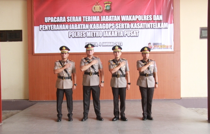 REPORTASE JAKARTAJAKARTA – Kapolres Metro Jakarta Pusat Kombes Pol. Komarudin, S.I.K., M.M. memimpin upacara dalam rangka serah terima jabatan Wakapolres dan penyerahan jabatan Kabag Ops dan Kasat Intelkam di Lapangan Apel Mapolres, Rabu (04/01/2023).