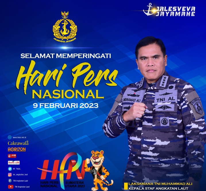 Jakarta, 9 Februari 2023,— Kebebasan Pers sebagai demokrasi yang bermartabat menjadi komitmen dalam Hari Pers Nasional Tahun 2023. Kepala Staf Angkatan Laut (Kasal) Laksamana TNI Muhammad Ali berada di tengah-tengah insan pers dalam kegiatan yang dipusatkan di Medan, Sumatera Utara, Kamis (9/02). Peringatan Hari Pers Nasional Tahun 2023 mengusung tema “Pers Merdeka, Demokrasi Bermartabat”. Kegiatan tersebut tahun ini diselenggarakan dengan sejumlah agenda, digelar mulai tanggal 7 hingga 12 Februari 2023. Pada puncak peringatannya dihadiri oleh Presiden Republik Indonesia Ir. Joko Widodo, serta sejumlah pejabat negara termasuk Kasal Laksamana TNI Muhammad Ali. “Selamat Hari Pers kepada seluruh insan pers nasional, Pers Merdeka Demokrasi Bermartabat”, ucap Kasal dalam unggahannya di berbagai Sosial Media resmi TNI AL. (Red).