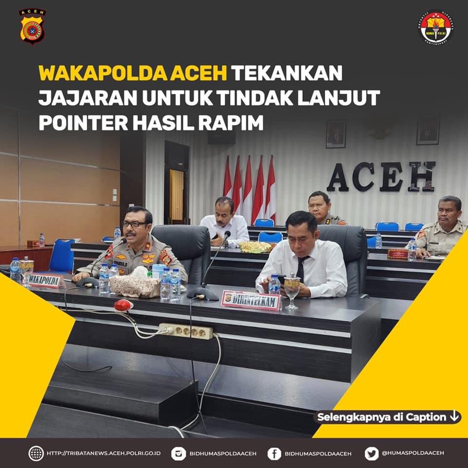 Banda Aceh – Wakapolda Aceh Brigjen Syamsul Bahri menekankan jajarannya untuk menindaklanjuti setiap pointer hasil rapat pimpinan (rapim) TNI-Polri yang digelar baru-baru ini.