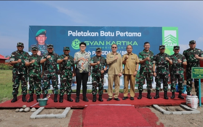 SUNGAL — Pangdam I/BB, Mayjen TNI A Daniel Chardin, SE, M.Si, melakukan peletakan batu pertama pembangunan Perumahan Gyan Kartika Recidence di Jln Medan-Binjai Km 13,5 Gg Gembira, Desa Sei Semayang Diski, Kecamatan Sunggal, Kabupaten Deliserdang, Selasa (28/2/2023).