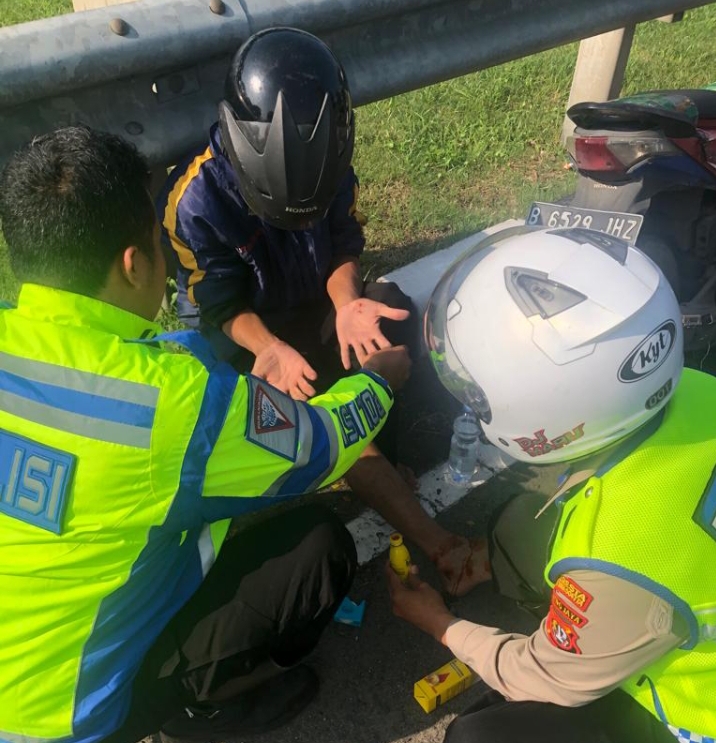 Anggota Satlantas Polresta Bandara Soekarno Hatta lainnya yang mengetahui kejadian itu segera mendatangi korban untuk memberikan pertolongan pertama. Diketahui korban mengalami luka-luka di bagian kaki dan tangan.