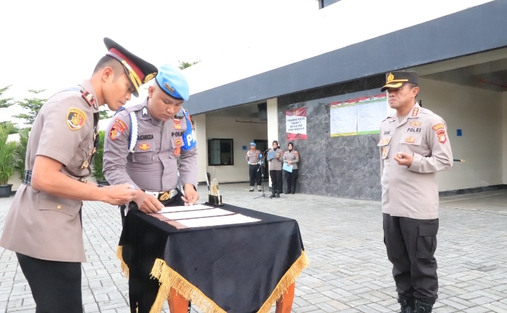Kapolres Metro Bekasi Kota Kombes Pol Dani Hamdani usai membacakan pengambilan sumpah jabatan Wakapolres baru didampingi rohaniawan, kemudian menyaksikan penandatanganan Surat Serah terima jabatan dari pejabat lama ke pejabat baru.