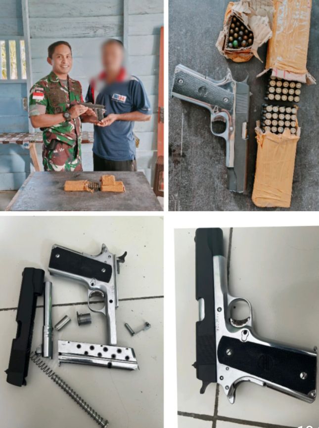 Semenjak Dokter Satgas melaksanakan pengobatan kepada Keluarga “MJ”, hubungan dengan Dansatgas semakin dekat dan menyampaikan bahwa ‘MJ” menyimpan senjata Api berjenis pistol peninggalan orang tua yang sudah meninggal. Tanpa menunggu lama Dansatgas mengecek senjata api tersebut, dan setelah diperiksa ternyata senpi pabrikan dari Filipina dengan model M1911 Kaliber 9 mm dan terdapat 100 butir Mu 9 mm jenis Luger serta 11 butir Mu 9 mm jenis Pindad.
