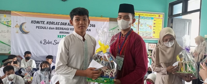 dan Siswa Siswi SMPN 246 Jakarta. Kholik Sadirin Wakil Kepala Sekolah Bidang Kurikulum dalam kesempatan memberikan statmennya terkait yang di gelar. “Kegiatan ini,sangat positif guna membina karakter peserta didik,kita laksanakan persenter ramadhan, dan juga berbagi kepada peserta didik yatim,piatu ataupun yatim piatu.Mereka bisa merasakan ke bahagiaan,dalam menyambut Idul Fitri.Harapannya anak anak dapat memahami seperti apa seharusnya mengisi kegiatan di bulan ramadhan, dengan ketakwaan yang bener,karena konsepnya amal tanpa info itu tidak berarti.Jadi kegiatan seperti ini kita berikan pengertian kepada anak anak tentang bagaimana sih kita seharusnya sebagai muslim mengisi kegiatan ramadhan itu sesuai dengan tuntunan surat al baqoroh 183 tujuan kita di tuntun untuk berpuasa agar kita menjadi mutakim menjadi insan insan yang bertakwa.” katanya. Ditempat yang sama Alumni SMPN 246 Angkatan tahun 2000 Ibu Keke Jakarta memberikan komentar terkait kegiatan yang digelar oleh Komite dan Korlas SMPN 246 tersebut. “Alhamdulillah berjalan dengan lancar, saya bahagia, bangga melihatnya, apa lagi kerjasama dengan komite dan juga ibu ibu yang lain, dari anggota osis juga antusias, juga saya dari angkatan tahun 1987 sampai angkatan terakhir titip salam dari semua, untuk adik adik semua, semoga semuanya berjalan dengan baik,Banyak banget perubahannya dan sangat jauh perubahannya dari mulai bangunannya dari semuanya.Cukup bangga liat SMP kita jauh banget perubahannya.Terus dilakukan sampai dimanapun.Kalau untuk acara amal tidak tidak ada abisnya semoga berkah buat kita semua.Semoga nanti orang tua yang lain terketuk hatinya untuk ikut serta juga,Harapannya yang terbaik buat semuanya untuk adik adik kita,semoga terus bertambah bertambah yang ikut serta jadi kedepannya lebih baik lagi.” ujarnya. Ketua Komite Sekolah SMPN 246 Jakarta Anandhela Heni M.Sindar yang juga tampak hadir memberikan tanggapannya. “Hari ini sebenernya di adakan pesantren kilat dari sekolah untuk anak anak kita,yang masa di bulan suci Ramadhan ini, kita tidak ada kegiatan,Jadi komite sekolah hanya menjembatani kerjasama dengan beberapa almamater, dengan pihak almamater itu sendiri sambutannya luar biasa, kita dapat bantuan,kita dapat support yang luar biasa, bisa terlaksana moment yang luar biasa ini.Alhamdulillah sudah ada kurang lebih sepuluh almamater siap bersinergi dengan komite sekolah, untuk kedepannya dari almamater 1987 sampai 2006.