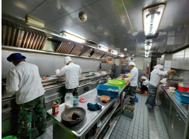 Meski ombak setinggi 2,5 – 3 meter mengiringi pelayaran KRI Bima Suci saat melintasi Laut Tirenia pada Jumat (26/05) menuju Algeria. Namun hal itu tidak menyurutkan semangat prajurit KRI Bima Suci khususnya departemen logistik untuk menjalankan tugas pokoknya yakni menyediakan dukungan makan prajurit Jalasena selama pelayarannya walaupun sesekali di guncang ombak.