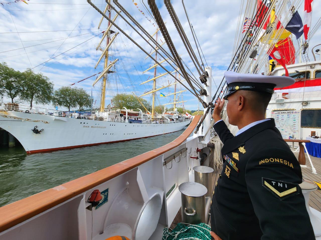 PRANCIS, 12 Juni 2023,—- Setelah menempuh pelayaran selama 9 hari dan berhasil menerjang cuaca yang cukup buruk di Teluk Bisqey selama beberapa hari, KRI Bima Suci akhirnya tiba di Grand Port Maritime, Rouen, Prancis pada Senin malam (12/06). Kedatangan KRI Bima Suci di Rouen dalam rangka menghadiri event parade kapal layar bergengsi berskala internasional yakni L’Armada Rouen 2023, yang digelar mulai tanggal 8 – 18 Juni 2023 bertempat di Kota Rouen, Prancis. Kedatangan KRI Bima Suci pada etape ketujuh di Prancis ini disambut oleh Panglima Koarmada RI Laksdya TNI Heru Kusmanto, Asathan RI Prancis Mayor Arh Nugroho Budi Prasetyo, Deputy Consuler Minister, Koordinator Fungsi Politik KBRI Prancis, Président de L’Armada Jean paul Rivière, Vice President Pierre Bellanger, Capitaine de Vaisseau (Kolonel Laut) Christian Bardou serta Capitaine de Corvette (Mayor) Guillaume Rueda. Keikutsertaan Indonesia di event L’Armada Rouen 2023 selain berpartisipasi dalam event Internasional parade kapal layar dari seluruh dunia dan memperkenalkan berbagai kesenian dan budaya Indonesia, juga sekaligus memperlihatkan kepada dunia kapal latih layar tiang tinggi milik TNI Angkatan Laut (TNI AL) KRI Bima Suci sebagai penerus pendahulunya yakni sang legenda KRI Dewaruci yang telah berusia puluhan tahun dan telah mengarungi berbagai belahan dunia. L’Armada Rouen 2023 merupakan event yang istimewa bagi KRI Bima Suci karena ini adalah pertama kalinya KRI Bima Suci mengikuti event di Eropa semenjak dibuat di Vigo, Spanyol pada 2017 silam. Event ini diikuti oleh 44 kapal layar dari 42 negara, dan KRI Bima Suci merupakan kapal layar terbesar yang hadir pada event berskala internasional tersebut. Pada kegiatan ini juga, sebanyak 68 Taruna Akademi Angkatan Laut (AAL) ke-70 bergabung dengan prajurit KRI Bima Suci untuk mengikuti event L’Armada Rouen 2023 dan kegiatan selama di Eropa. Rencananya KRI Bima Suci akan sandar selama 6 hari dan akan melaksanakan sejumlah rangkaian kegiatan L’Armada 2023 serta kegiatan lain seperti pembekalan Dubes RI Luar Biasa dan Berkuasa Penuh (LBBP) Prancis, Bapak Mohammad Omar, pembekalan Pangkoarmada RI, L’Armada crew parade, kunjungan kehormatan kepada pejabat setempat, Open Ship, dan pada tanggal 18 Juni 2023, kegiatan akan ditutup dengan kegiatan grand parade day yaitu konvoi oleh seluruh kapal peserta meninggalkan event L’Armada Rouen Ditempat terpisah Kepala Staf Angkatan Laut (Kasal) Laksamana TNI Muhammad Ali menyampaikan bahwa peran serta TNI AL dalam pelayaran muhibah diplomasi dan duta bangsa merupakan implementasi dari cita-cita bangsa Indonesia untuk menciptakan persahabatan dan memperkenalkan budaya Indonesia kepada masyarakat dunia. “Maka dari itu para prajurit yang ditugaskan harus bangga karena merupakan bagian dari kepercayaan yang diberikan oleh negara”, tegas Kasal. (Red).