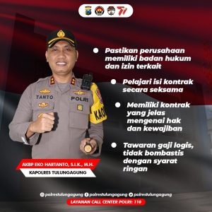 “Dalam rangkaian HUT Bhayangkara ke 77, Polres Tulungagung melaksanakan beberapa kegiatan mulai Baksos, Bansos, lomba lomba, Larin 6 KM, olah raga dan carnival kearifan Lokal”, tandasnya.