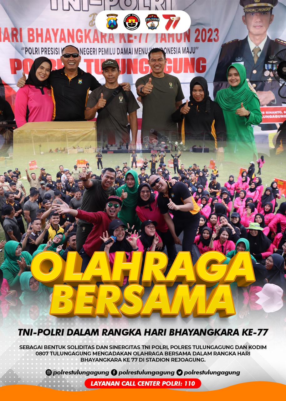 “Kegiatan Olah raga bersama ini dalam rangkaian Hari Bhayangkara ke 77, dengan harapan sinergitas TNI dan Polri dapat terus kita pupuk dan tingkatkan bersama untuk mejutkan kondusifitas dalam negeri, untuk mengawal Pemilu damai menuju Indonesia maju di Tahun 2024”, kata Kapolres Tulungagung AKBP Eko Hartanto S.I.K, M.H dalam sambutannya.