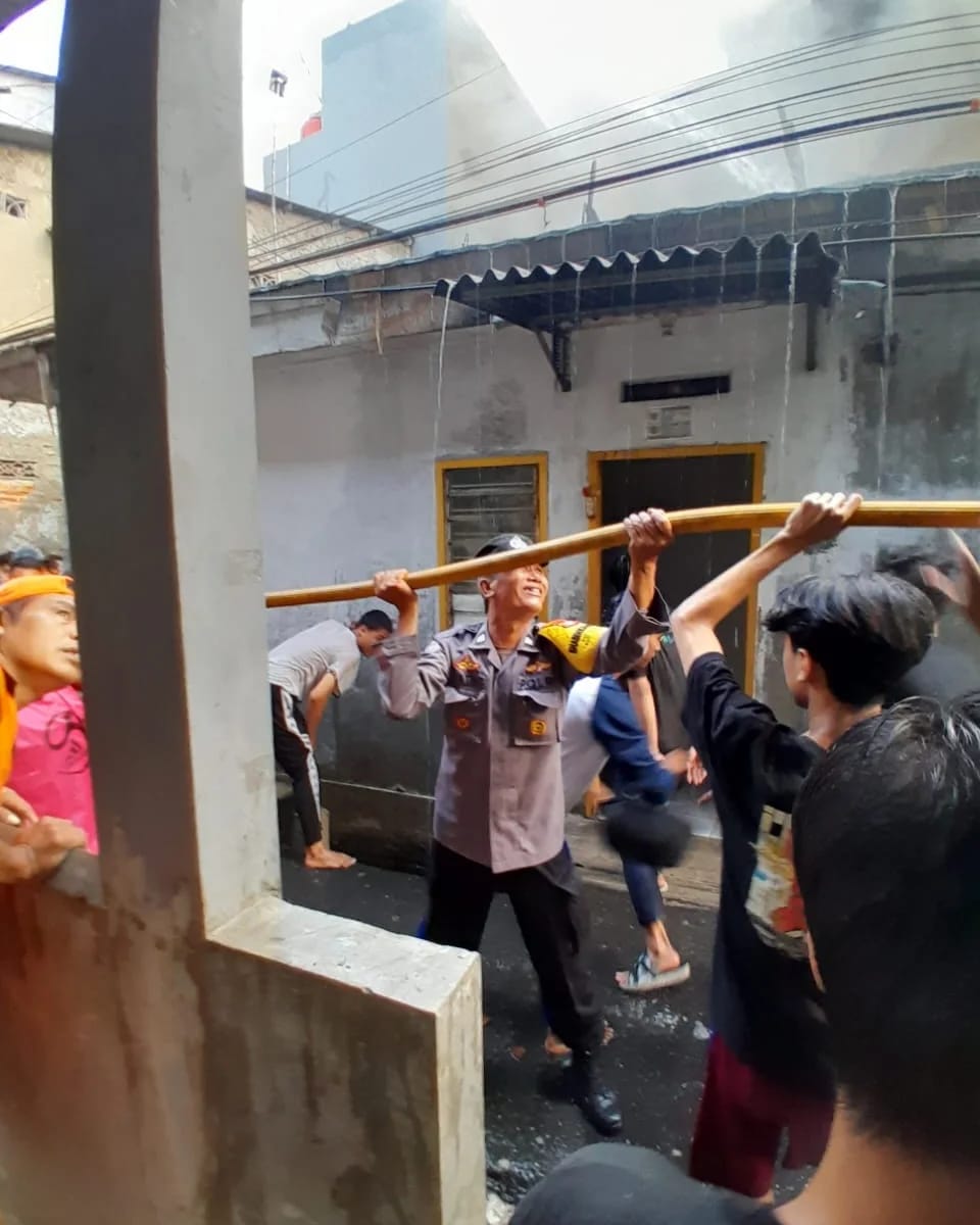Terlihat dilokasi aksi babinkamtibmas kelurahan tangki polsek metro taman sari Aiptu Yatno berjibaku dengan pakaian basah dibantu dengan warga berusaha memadamkan kobaran api yang melanda 3 buah rumah di jalan tangki Ibrahim rt 12/06 kel tangki taman sari Jakarta Barat pada minggu pagi (25/6/2023)