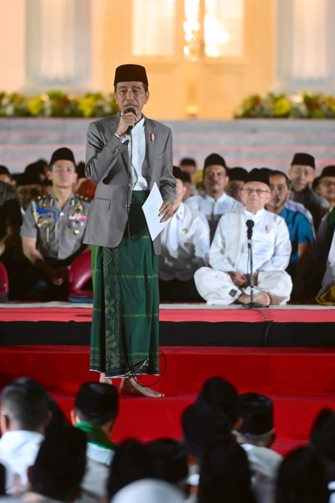 Presiden Joko Widodo beserta Ibu Iriana Joko Widodo menghadiri acara zikir dan doa kebangsaan di halaman Istana Merdeka, Jakarta, pada Selasa, 1 Agustus 2023. Acara tersebut merupakan bagian dari rangkaian kegiatan peringatan Hari Ulang Tahun (HUT) ke-78 Kemerdekaan Republik Indonesia.