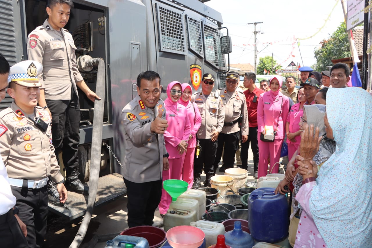 REPORTASE JAKARTACIREBON — Jajaran Polresta Cirebon menyalurkan bantuan air bersih untuk warga terdampak kekeringan di Desa Slangit, Kecamatan Klangenan, Kabupaten Cirebon, Senin (7/8/2023). Dalam kegiatan tersebut juga Polresta Cirebon melaksanakan bakti kesehatan berupa pengobatan gratis bagi lansia dan balita.