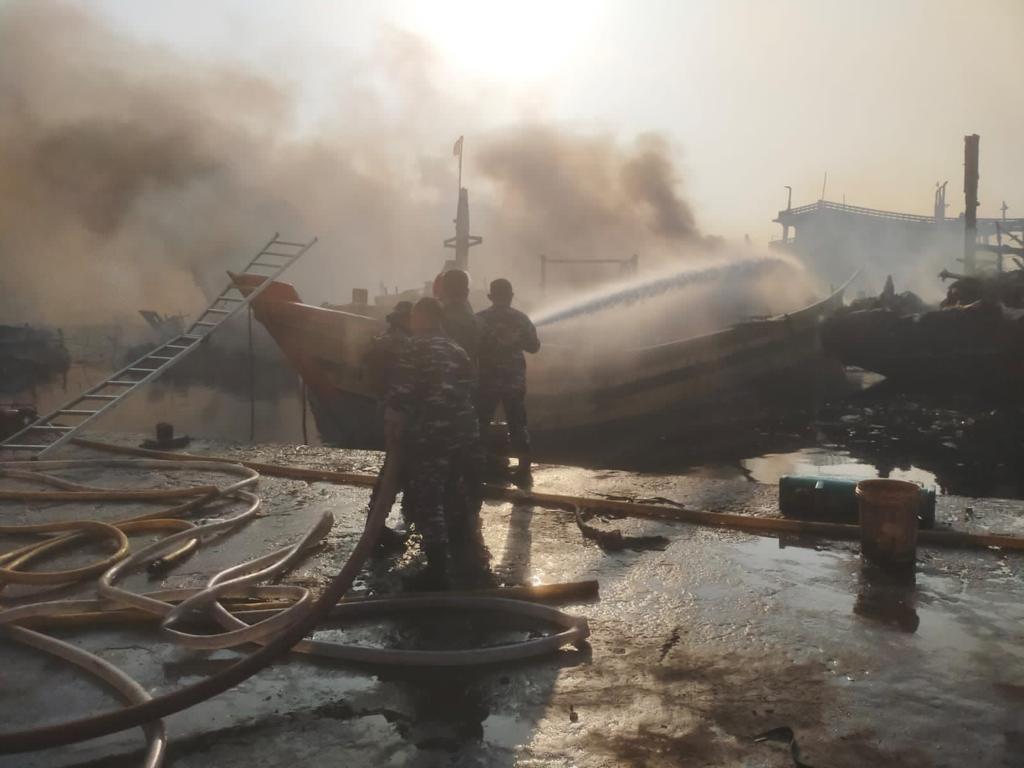 Jalesveva Jayamahe,Jakarta, 16 Agustus 2023 — Tim Siaga Bencana Pangkalan TNI AL (Lanal) Tegal bersama Polresta Tegal, Damkar Kota Tegal dan masyarakat membantu dalam upaya pemadaman api kebakaran kapal nelayan di Pelabuhan Jongor Tegalsari, Kota Tegal, Senin (14/08). Menurut informasi dari warga sekitar, kejadian berawal ketika terlihat percikan api menyala dari salah satu kapal yang bersandar di dekat Stasiun Pengisian BBM Nelayan KUD Karya Mina. Kebakaran terjadi Senin, 14 Agustus 2023 pukul 18.30 WIB dan hingga saat ini belum diketahui penyebab pasti kebakaran kapal yang sedang bersandar tersebut. Dalam upaya penanggulangan kebakaran kapal nelayan tersebut sejumlah armada pemadam kebakaran dari Kota Tegal, Kabupaten Tegal dan Brebes dikerahkan ke lokasi kejadian. Sampai dengan hari ini api masih belum padam seluruhnya dan Tim Gabungan terus melakukan upaya pemadaman api. Diperkirakan lebih dariย 52 kapal yang terbakar dari 26 pemilik Kapal. Komandan Lanal Tegal Letkol Mar Moch. Chanan Asfihani, M.Tr.Hanla. turut hadir dan berkoordinasi dengan instansi terkait dalam penanggulangan bencana kebakaran tersebut. โKebakaran kapal yang terjadi malam ini belum diketahui pasti penyebabnya dan Pangkalan TNI AL Tegal menerjunkan prajuritnya yang sedang terlibat siaga bencana untuk bergabung dengan tim petugas kebakaran dan instansi terkait dalam penanggulangan kebakaran. Apabila nanti di butuhkan lagi akan kami kirim personil lagi sesuai kebutuhanโ, jelasnya Danlanal Tegal. Selain itu, dampak dari kebakaran kapal nelayan ini yaitu polusi asap di wilayah sekitar pelabuhan. Melihat kejadian tersebut, prajurit Lanal Tegal dengan suka rela membagikan sebanyak 2000 masker kepada masyarakat sekitar yang melintas di kawasan TPI Jongor tersebut. Hal ini diharapkan dapat mengurangi terjadinya gangguan pernafasan dan melindungi dari polusi udara yang disebabkan asap kebakaran kapal. Pada kesempatan terpisah, Kepala Staf Angkatan Laut (Kasal) Laksamana TNI Muhammad Ali menyampaikan kepada seluruh jajaran TNI AL untuk meningkatkan kesiapsiagaan dalam merespon cepat informasi yang diterima dari masyarakat, dalam hal ini aksi penanggulangan kebakaran kapal yang terjadi di Pelabuhan Jongor Tegalsari, Kota Tegal dan memberikan bantuan masker kepada warga sekitar yang terdampak polusi asap kebakaran. (Red).