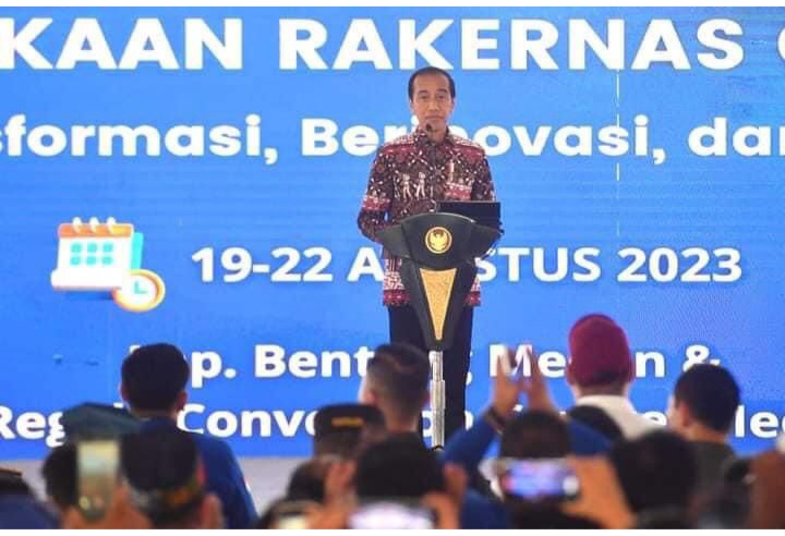 REPORTASE JAKARTASUMUT — Presiden Joko Widodo menghadiri pengukuhan kepengurusan dewan pimpinan pusat (DPP) dan peresmian pembukaan rapat kerja nasional (rakernas) Gerakan Angkatan Muda Kristen Indonesia (GAMKI) Tahun 2023 di Lapangan Banteng, Kota Medan, Provinsi Sumatra Utara, Sabtu, (19/08/2023).