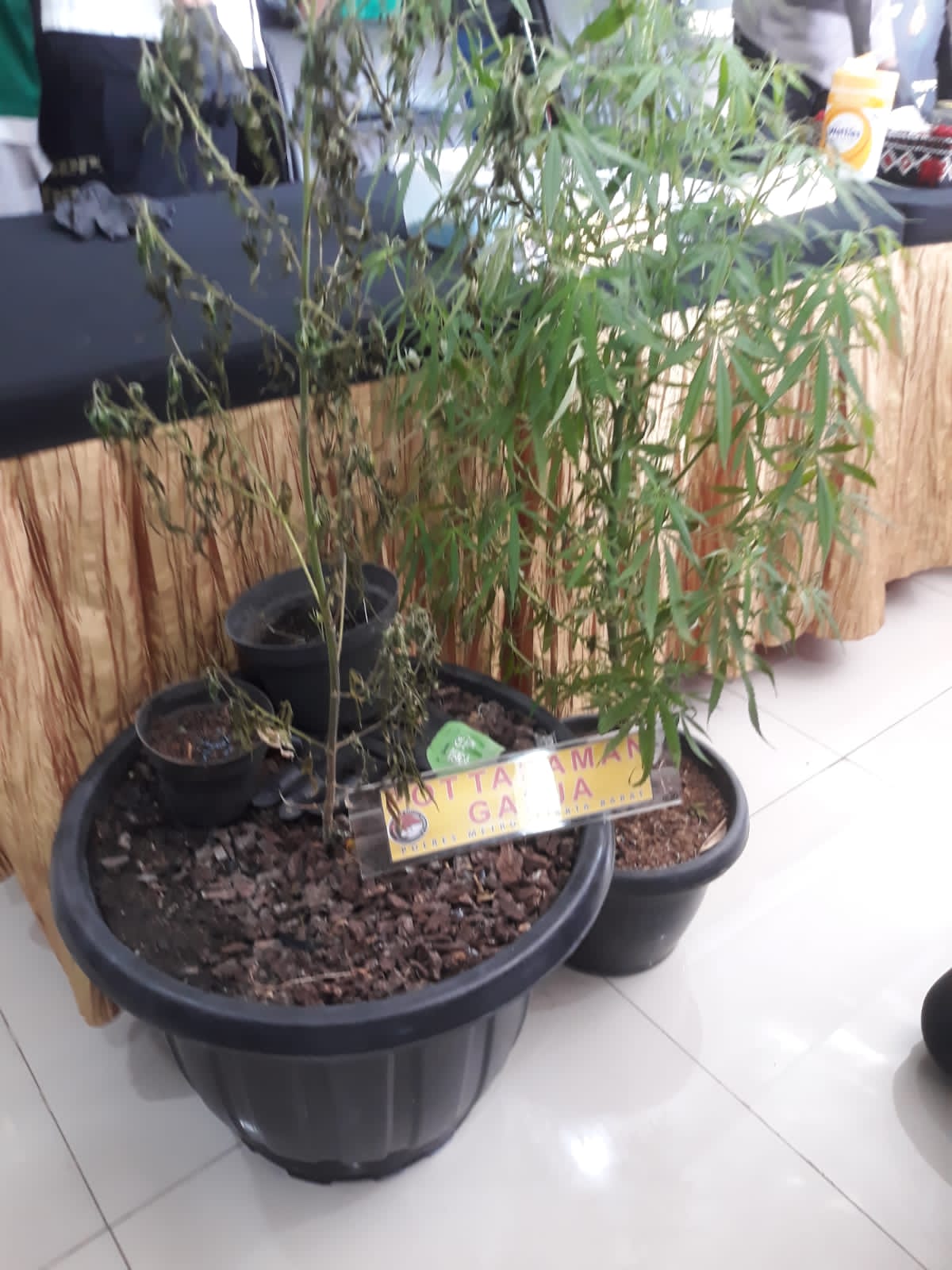Setelah dilakukan pemantauan dan dilakukan pengeledahan di temukan barang bukti 3 botol biji ganja di meja depan kamar, selanjut nya team temukan 5 pot tamanan ganja, terdiri dari 2 pot kecil dan 3 pot besar dan 1 pak pupuk yang tersimpan di lantai 2 teras rumah milik saudara AH.