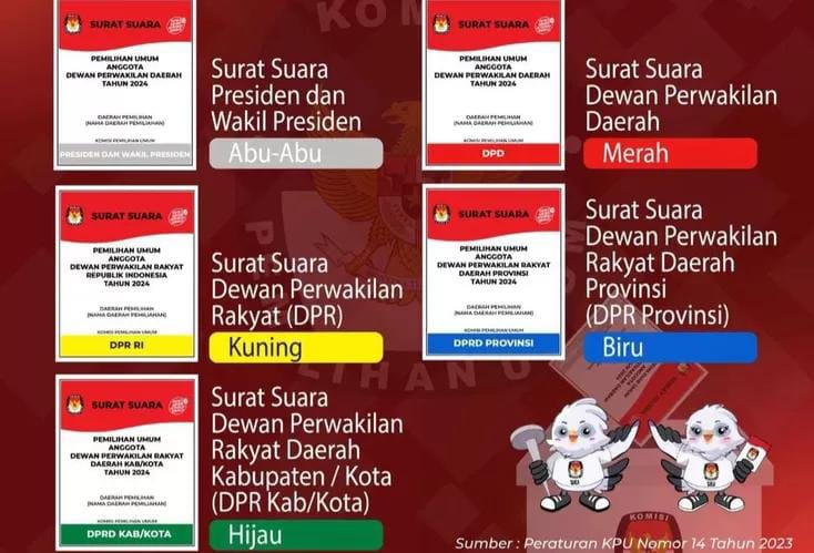 Dalam rangka menyukseskan proses penting untuk pemilihan para pemimpin rakyat ini, Komisi Pemilihan Umum (KPU) sudah memutuskan bahwa masyarakat Indonesia sebagai pemilik hak pilih akan mendapatkan 5 surat suara .