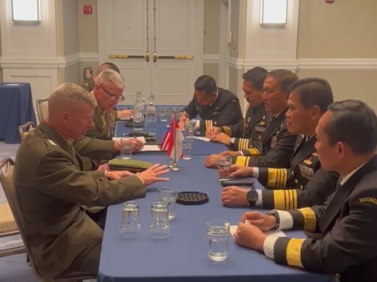Jakarta, 21 September 2023 — Guna meningkatkan kerjasama dengan negara sahabat dan profesionalitas prajurit Korps Marinir TNI Angkatan Laut (TNI AL), Kepala Staf Angkatan Laut (Kasal) Laksamana TNI Muhammad Ali, melaksanakan pertemuan bilateral dengan Acting Commandant United States Marine Corps (USMC), General Eric M. Smith bertempat di Ruang Bilateral Meeting, Newport Harbour Island Resort, Selasa (19/09). Pertemuan yang berlangsung hangat dan penuh keakraban tersebut, menghasilkan beberapa kesepakatan penting yang akan memberikan manfaat untuk kedua belah pihak kedepannya. Dalam kesempatan ini, TNI AL dan USMC sepakat untuk membahas peningkatan kerjasama yang fokus pada peningkatan Personnel Capability sebagai pembahasan utama. General Eric M. Smith menyampaikan bahwa USMC akan membuka peluang pendidikan dan latihan dengan Korps Marinir TNI AL. Lebih lanjut, General Eric M. Smith juga menyampaikan keinginannya untuk dapat meningkatkan hubungan persahabatan antara kedua belah pihak, terutama dalam meningkatkan hubungan antar personel Marinir. Interaksi antar personel yang merupakan generasi muda milenium yang nantinya dapat menjadi peluang bersama dalam meningkatkan kesepahaman dan sikap saling percaya untuk dasar peningkatan kerjasama strategis lainnya di waktu yang akan datang. Sementara itu, Kasal menyampaikan kesediaannya untuk terus meningkatkan hubungan kerjasama profesionalisme antara prajurit marinir, serta mengajak pihak USMC untuk mendukung, membantu pengembangan dan peningkatan profesionalitas yang didasari oleh pengalaman dan wawasan dari USMC pada beberapa penugasan sebelumnya. Menurut Kasal, berbagi pengalaman praktisi merupakan salah satu faktor penting dalam penyusunan dan pengembangan kemampuan. Laksamana TNI Muhammad Ali juga mempersilahkan pihak USMC untuk berpartisipasi dalam latihan bersama dengan prajurit Marinir TNI AL, terutama fokus pada materi yang memberi manfaat bagi kedua belah pihak. Pada kesempatan ini, Kasal berharap dengan terselenggaranya pertemuan bilateral dengan USMC sebagai refleksi komitmen nyata TNI AL dalam menjaga dan meningkatkan hubungan persahabatan dan kerjasama secara profesional antara TNI AL dengan USMC secara berkelanjutan. (Red).