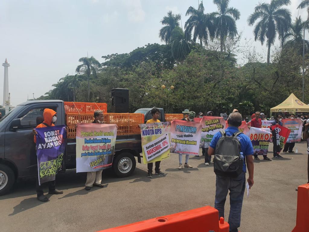 mandiri dibiarkan berproduksi dengan biaya produksi yang tinggi, yang seharusnya harga input sapronak bisa lebih murah dikarenakan sudah swasembada ayam pedaging.” katanya. Sewajarnya perusahaan integrasi vertikal menjual pakan dan DOC nya lebih murah dibanding kompetitornya sebab mereka mendapatkan bahan baku pakan serta kuota Impor GPS lebih banyak daripada kompetitornya mengapa malah sebaliknya menjual lebih mahal dibanding kompetitor mereka.Kesulitan yang dialami peternak mandiri dan peternak rakyat ini tidak dapat dilepaskan dari langkah kebijakan Kementerian/Lembaga terkait, tidak memiliki orientasi yang jelas dalam melindungi peternak mandiri dan peternak rakyat dan telah diamanatkan dalam UUD 45 Pasal 28G ayat 1 dan Pasal 28H ayat 1 tentang Hak atas perlindungan diri pribadi dan Hak Hidup sejahtera. Harry Widyantoro sebagai Korlap Aksi menambahkan bahwa pada saat peternak mandiri panen justru harga ayam hidup selalu dirusak oleh para integrator ayam hidup (Life Birds) yang menjual dibawah Harga Pokok Produksi peternak mandiri “sehingga selalu saja peternak mandiri menjadi korban, tetapi anehnya para Feedmill dan breeder justru dapat menciptakan pelaku baru untuk bermitra dengan iming-iming bahwa berproduksi ayam pedaging menciptakan peluang serta keuntungan luar biasa padahal justru menjerumuskan investor kepada kebangkrutan dan bahkan ada beberapa peternak mandiri yang bunuh diri karena jeratan hutang.”pungkasnya.