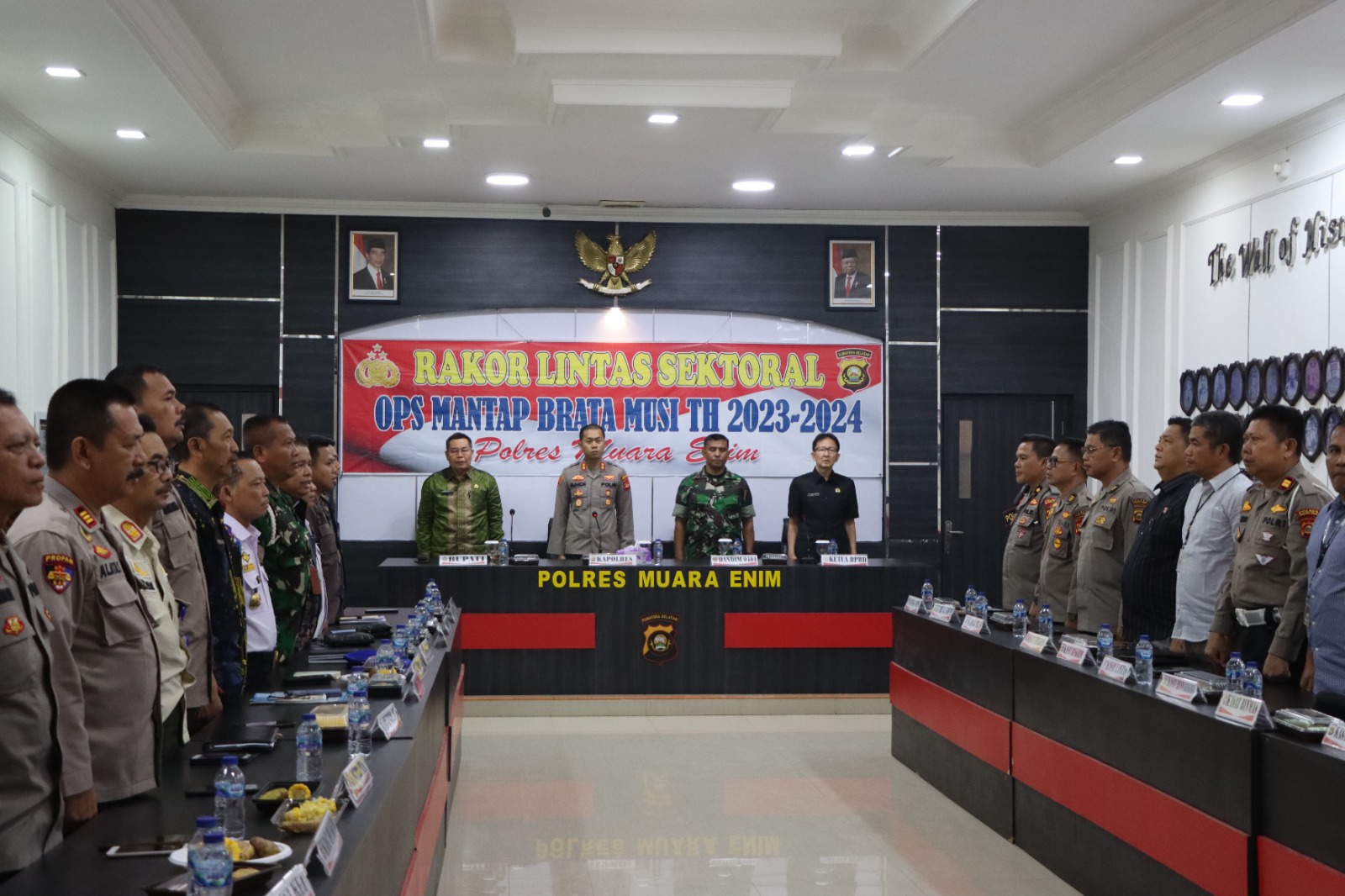 Muara Enim – Rapat Koordinasi Lintas Sektoral Operasi Mantab Brata Musi 2023-2024 di Aula Rupatama Polres Muara Enim. Hadir dalam kegiatan Rakor Lintas Sektoral, Kapolres Muara Enim AKBP Andi Supriadi SH SIK MH, Pj. Bupati Muara Enim yang diwakili As 1 Drs. H. Embran Tabrani, MSi, dan Forkopimda Kabupaten Muara Enim, Ketua KPU, Ketua Bawaslu, Dansubden Pom Muara Enim, OPD Kepala Dinas, Kepala Badan dan PJU Polres Muara Enim Tujuan rapat ini adalah untuk memastikan kesiapan, koordinasi, dan sinergi antar-instansi dalam menghadapi Pemilu 2024 yang aman dan damai, Kamis (12/10/23).