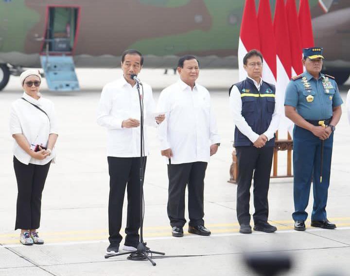 (Puspen TNI). Panglima TNI Laksamana TNI Yudo Margono, S.E., M.M. mendampingi Presiden Joko Widodo pada acara pengiriman bantuan ke Palestina bertempat di Baseoff Lanud Halim Perdana Kusuma, Jakarta Timur, Sabtu (4/11/2023).