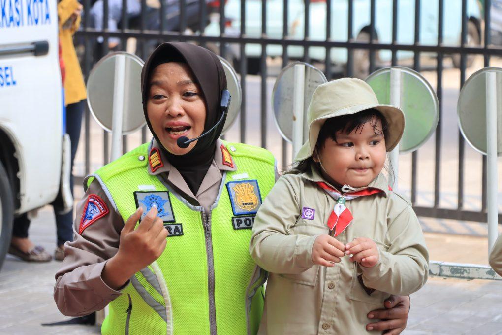 BEKASI – Polisi Satlantas Polres Metro Bekasi Kota hadir di Sekolah TK Muslihat 1 Kranji Kota Bekasi, Kamis (2/11/2023).