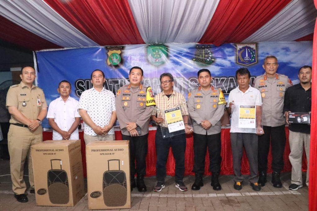 Pada kegiatan ini, Karyoto juga memberikan bantuan 7 buah speaker portable, 7 Barcod kamtibmas dan 2 Senter kepada kelurahan Setempat dan menerima 69 senjata tajam alat tawuran dari masyarakat untuk diamankan pihak kepolisian.