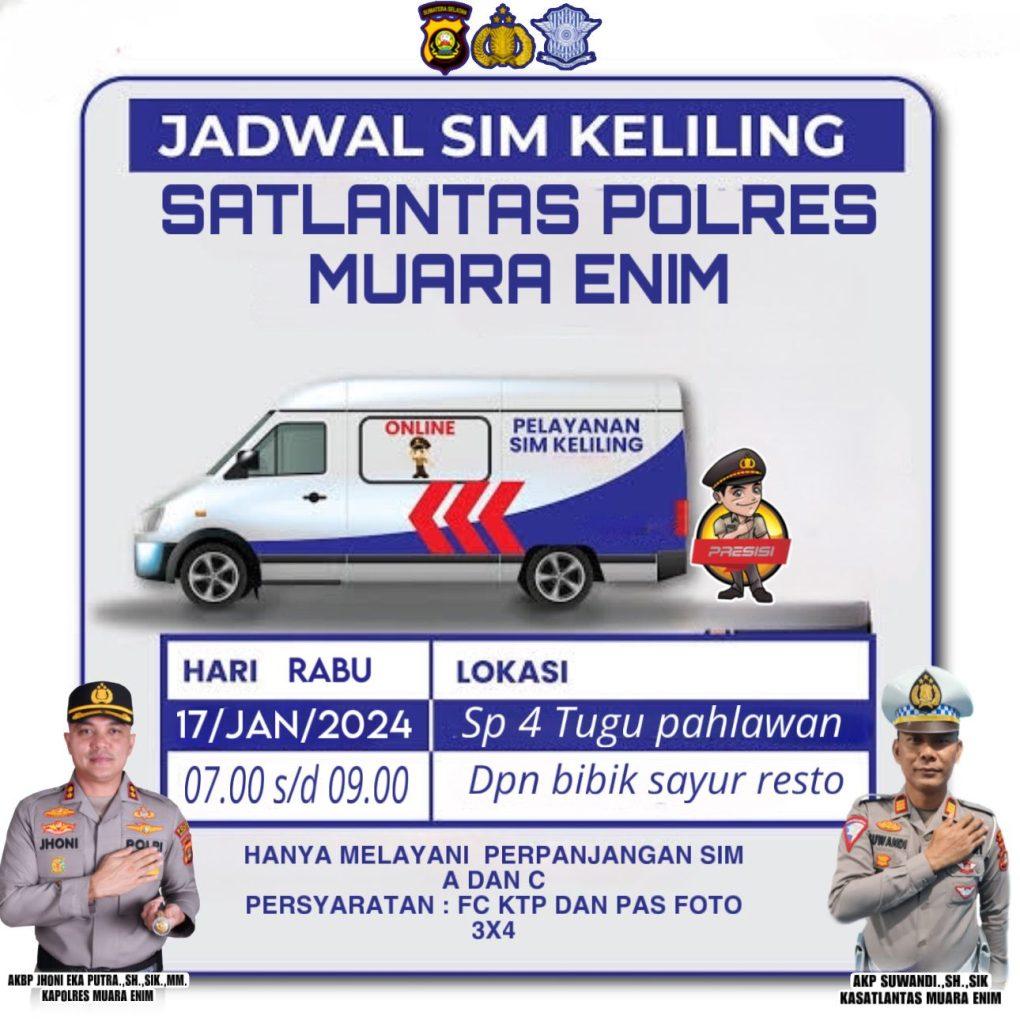 Melalui Mobil Pelayanan SIM Keliling. Kasat Lantas Polres Muara Enim AKP Suwandi, SH, MSI terus melakukan Pelayanan Prima kepada masyarakat dalam hal perpanjangan SIM A dan C. Adapun tempat-tempat yang dianggap strategis meliputi, SP 4 Tugu Pahlawan depan Bibik Sayur Resto Jadwal pelayanan perpanjangan SIM ini hari Rabu tanggal 17 Januari 2024 , pukul 07.00 sampai 09.00 maka ada baiknya catat waktu dan tempatnya. Diharapkan, kepada masyarakat sebelum menuju lokasi perpanjangan SIM tersebut, dapat memeriksa kembali persyaratan yang diwajibkan, yaitu: