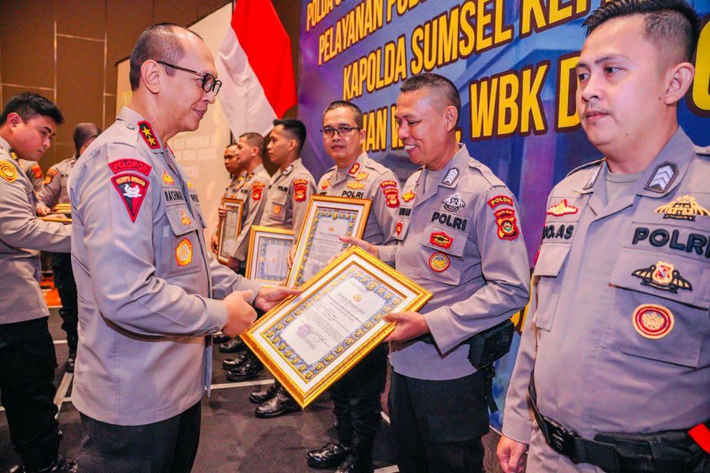 sepenuhnya, bahwa baik dan buruknya pelayanan Polri kepada masyarakat di Provinsi Sumatera Selatan berada di tangan Polda Sumsel. Harapan masyarakat saat ini terhadap peningkatan kualitas pelayanan publik sangat besar, karena Polri di tuntut untuk mampu memberikan pelayanan publik yang semakin cepat, mudah, murah terjangkau dan terukur, saya mengucapkan selamat atas pencapaiannya dan agar ini dijadikan dorongan support bagi satker lainnya” ujarnya. Penerima Penghargaan WBBM dan menerima PIN Emas dari Kapolda Sumatera Selatan diantaranya AKBP Dolly Gumara, S.I.K., M.H (Kabag RBP Birorena), Kompol Candra Kirana Putra, S.I.K., S.H., M. Si., Cphr (Kasubbagmutjab Bagbinkar Ro SDM), AKP Ramadhi Kurniawan, S. Kom (Kaurmintu Subbagrenmin Ro SDM), Ipda M. Syazilli, S.H., M.H (Pama Bag RBP Rorena) dan Brigadir Andre Amza (Bamin Subbagpangkat Bagbinkar Ro SDM). Sedangkan penerima penghargaan WBK yaitu AKBP Rahmat Sihotang, S.H., M.H. (Kasubdit Gakkum Dit Polairud), Bripka Sarwani (Bamin Ditpolairud), Brigadir Eko Agus Sutrisno (Bamin Ditpolairud) dan Bripka Kgs. Husin (Bamin Rbp Rorena) Sementara untuk penerima penghargaan Quick Win Presisi diantaranya Kompol Robinson, S.E. (Kabagren Polres Prabumulih), Kompol Arifin, S.H., M. Si (Kabagren Polres Muara Enim) dan Bripda Arif Fadilah (Bamin Bag RBP Polda Sumsel). Acara yang digelar Rabu (24/1/2024) disalah satu hotel dikota Palembang tersebut dihadiri Wakil ketua Ombudsman RI, Ir Robby Hamzar Rafinus MIA, Ombudsman RI perwakilan Sumatera Selatan, Dekan Univ Sriwijaya, para PJU Polda dan Kapolres/tabes jajaran Polda Sumatera Selatan. (Yogie Kaperwil Sumsel).