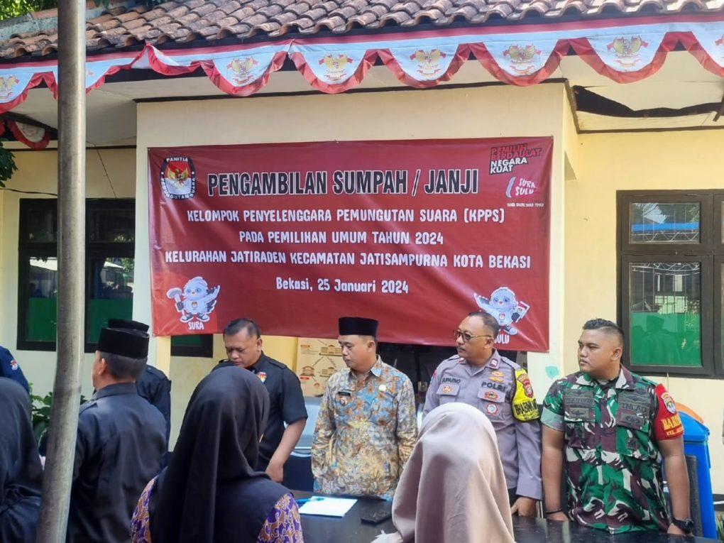 REPORTASE JAKARTAKOTA BEKASI — Pelantikan dan pengambilan sumpah KPPS Se-Kelurahan Jatiraden untuk Pemilu 2024 yang dilakukan di Halaman Kelurahan Jatiraden Rt 01/06 Kelurahan Jatiraden Kecamatan Jatisampurna, mendapat pengamanan dari pihak kepolisian.